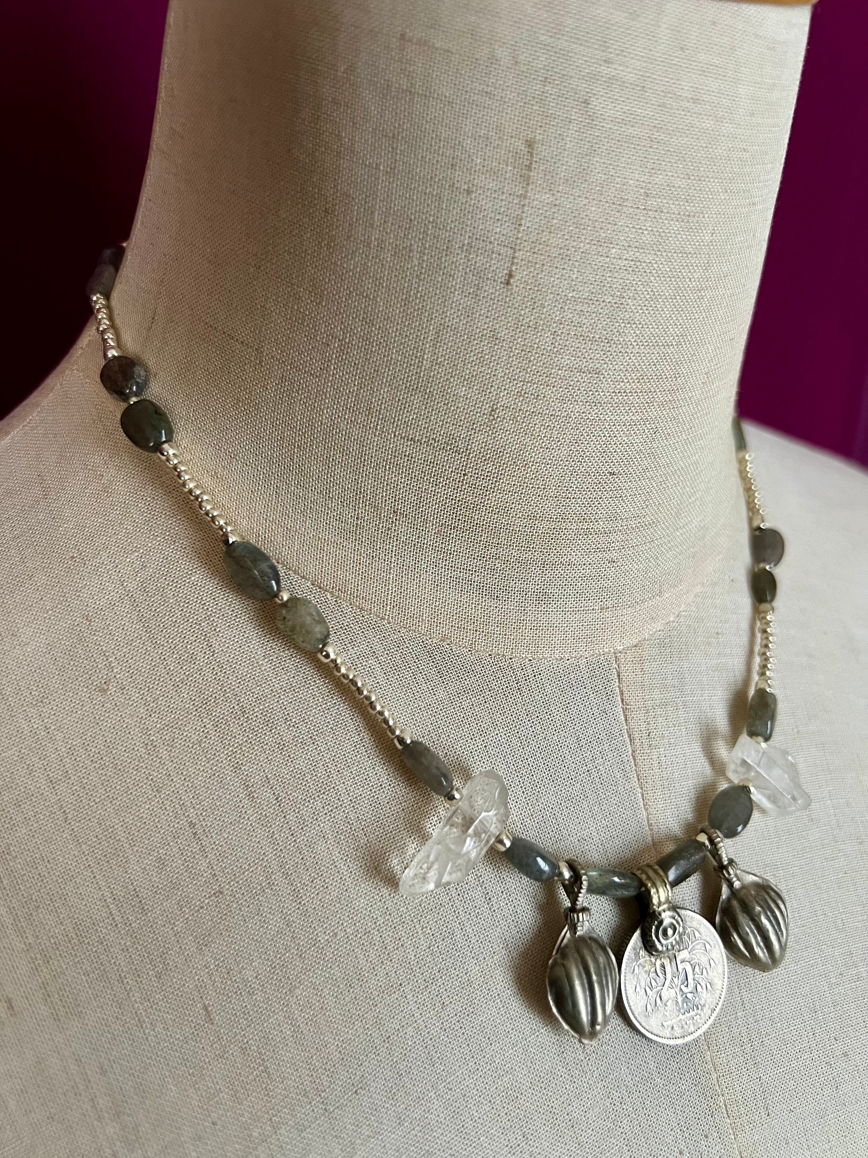 オーロラのような輝きが特徴的なラブラドライトと氷のようなクリスタルが美しいネックレスです。