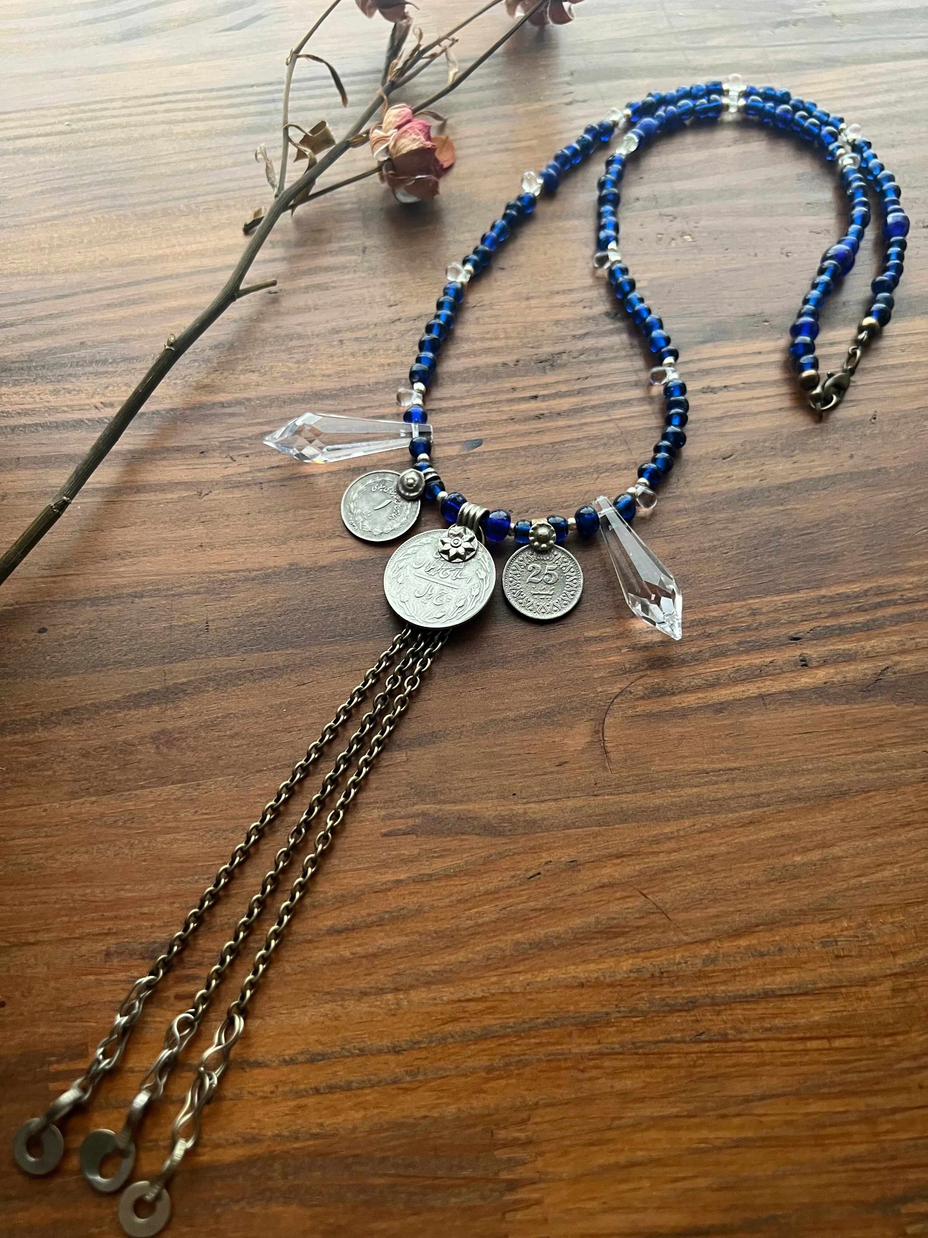 透け感のある美しい青色ビーズと透明感のあるクリスタルがマッチしたネックレスです。