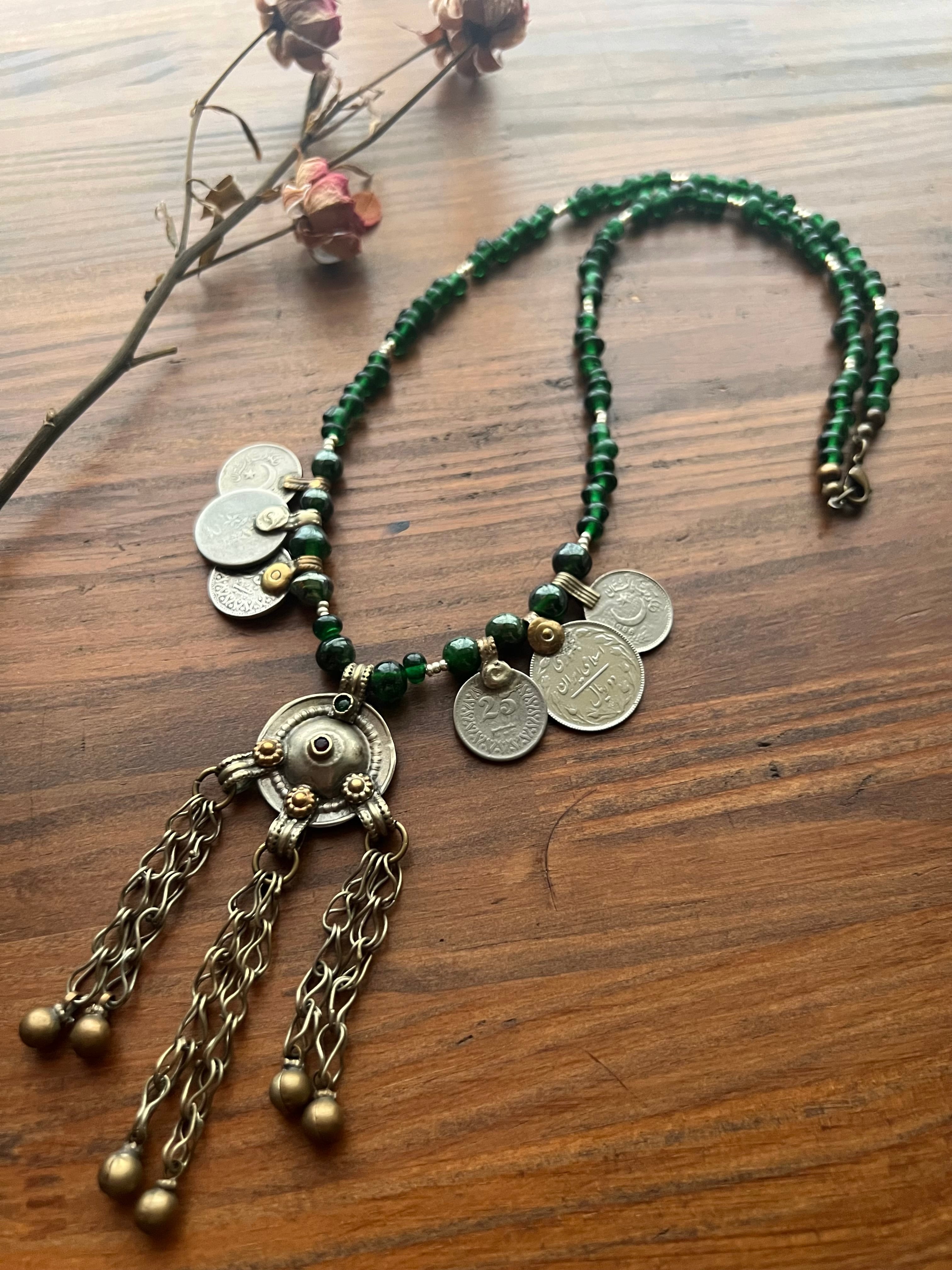 透け感のある美しい緑色ビーズとKuchiコインのネックレスです。
